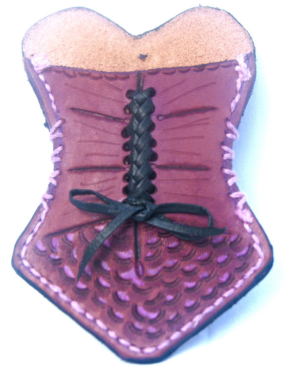 Thin ID/card wallet or holder that holds approximately 6 cards and is shaped liked a corset. Back veiw showing decorative lacing