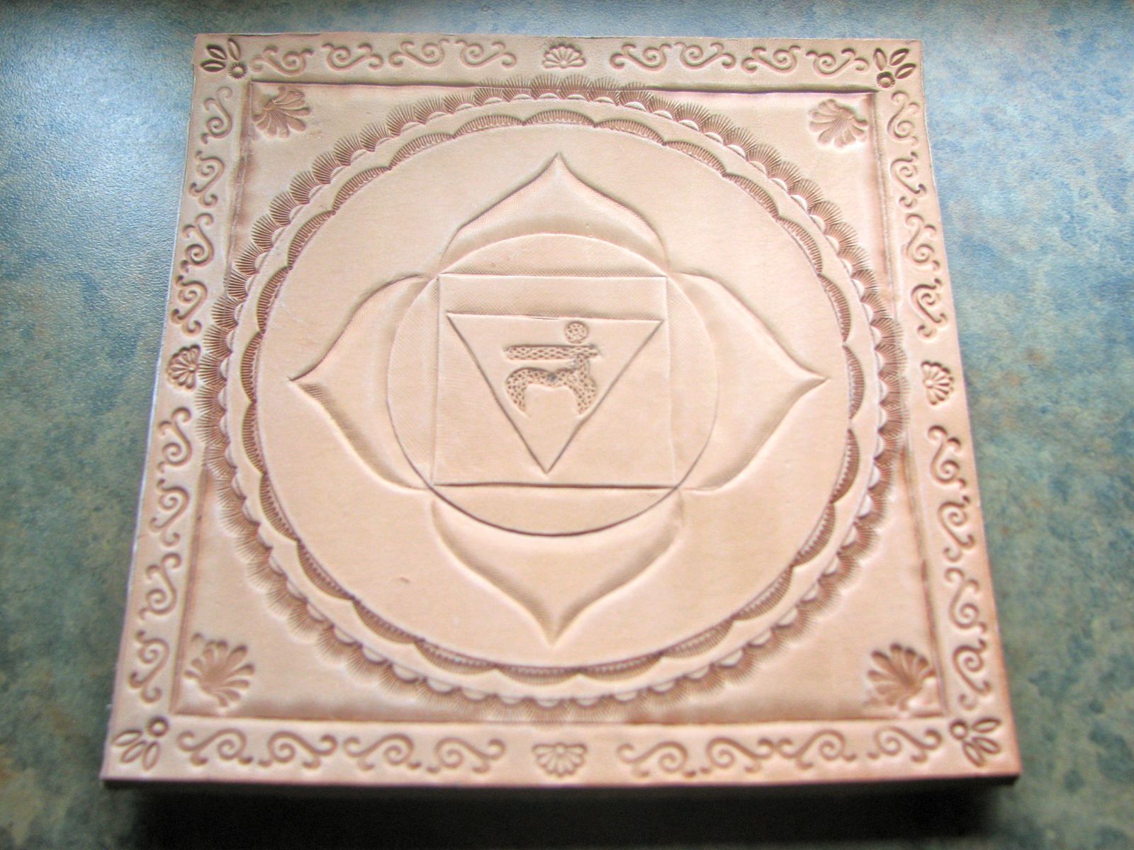 Hand tooled leather art of Muladhara, the root chakra, prior to being dyed