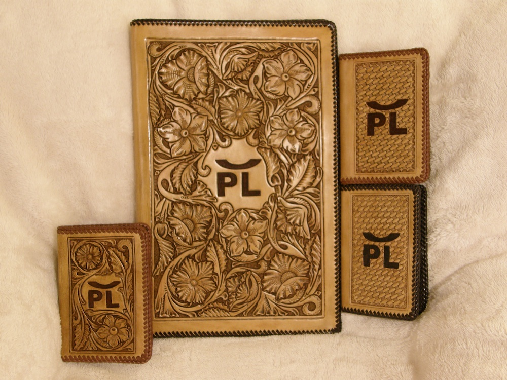 The large notebook is a 8x14 size legal sized notebook. The smaller notebooks hold 3x5 spiral notebooks. The ranch brand in the center was done to look like an actual brand. One of the small notebooks has a floral design similar to the legal sized one, and the other two are basket stamped.