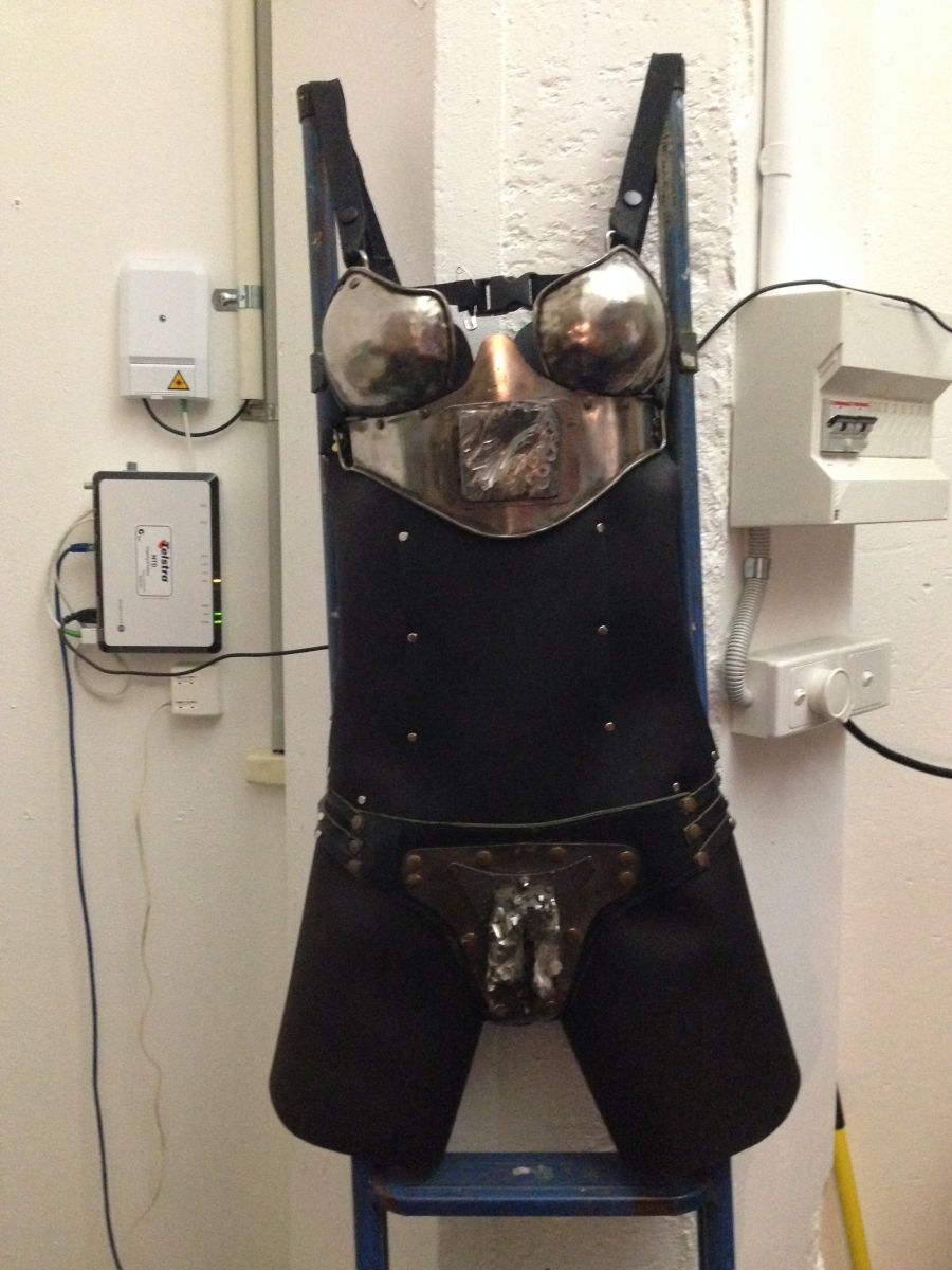 My friend Lil does a angle grinder act in her performances where she uses a grinder onto the metal pieces in between her breasts and on her crotch to create sparks. She needed a leather protector underneath the metal outfit and this is the protoype for it. She used this one at the opening of the remake of the Mad Max movie in Sydney, Australia.