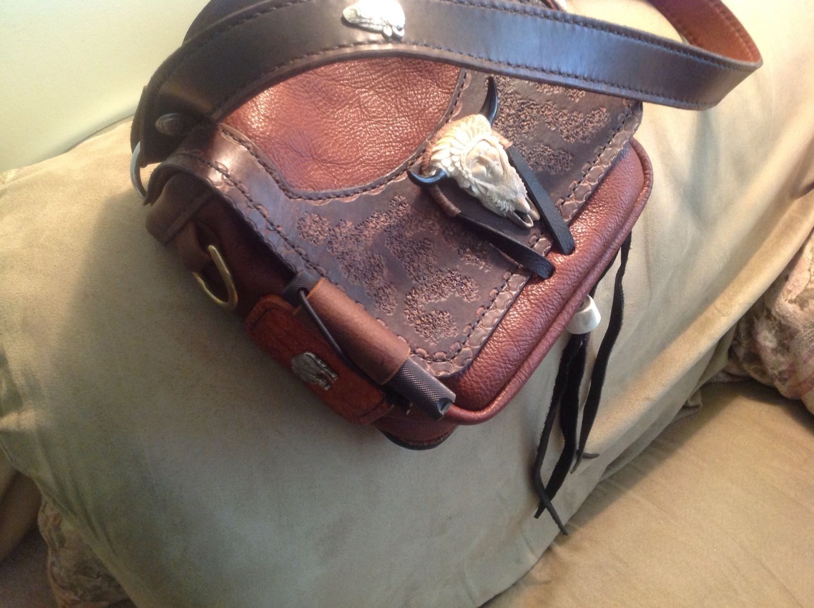 This bag is made with buffalo and veg tan leather with some real nice hand carved deer antler figurines attached as hold downs for the pockets.