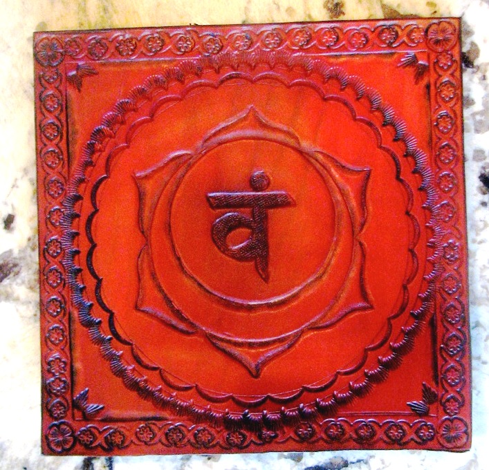 The Sacral Chakra represented in hand tooled leather, measuring 6"x6"