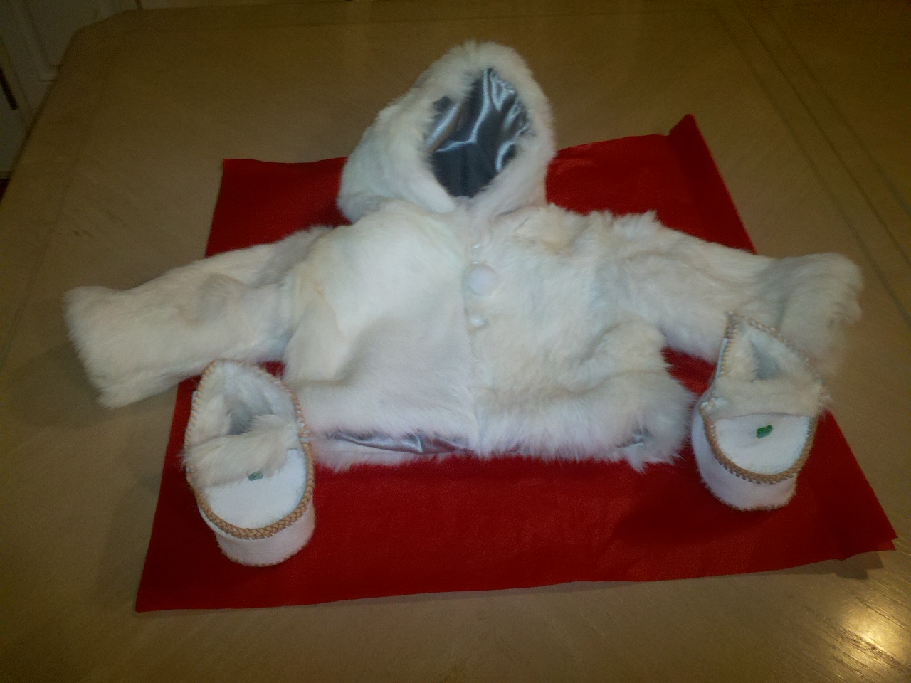 Made these for my cousins new baby. White rabbit skin coat made by my girlfriend.