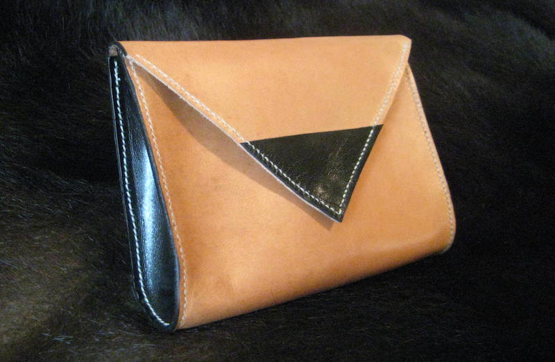 A simple 2-toned clutch. 3/4 oz Hermann Oak, Shrut & Asch kidskin. U-shaped gussets, hand stitched waxed Irish linen thread and a brass snap.
