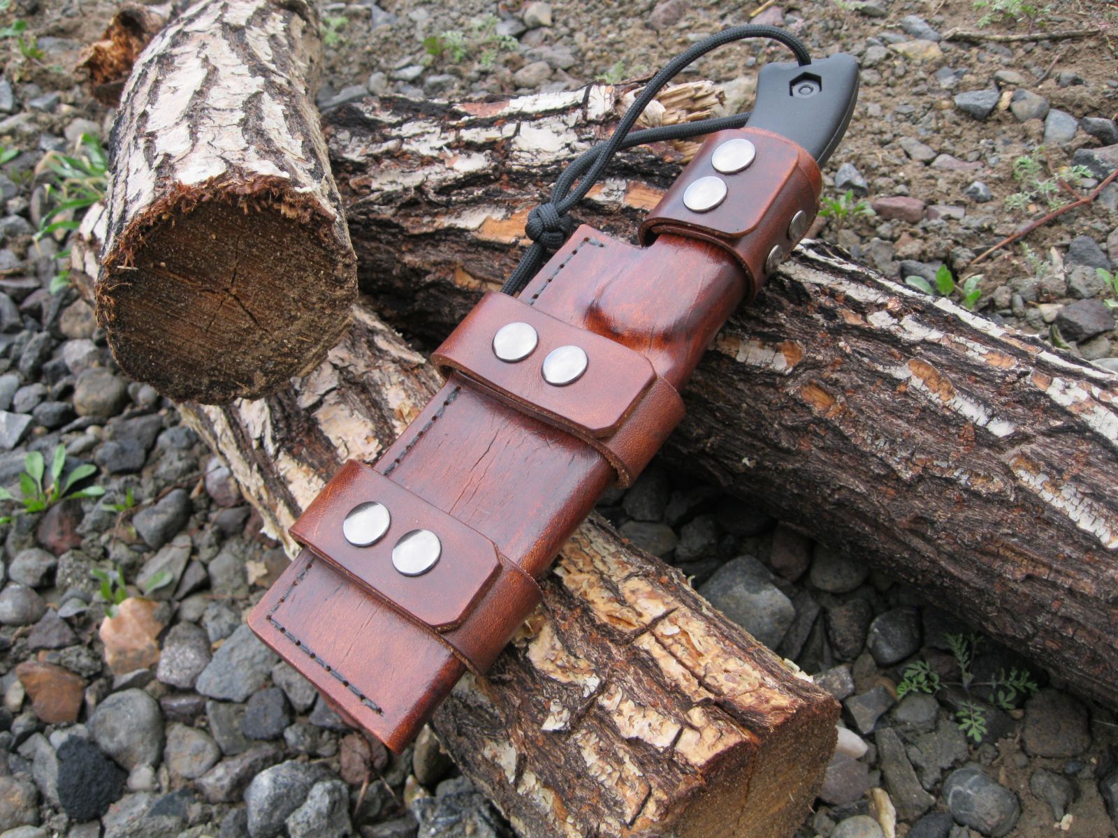 Leather knife sheath for my Ka-Bar Becker BK17. It's 6/7 oz. leather dyed timber brown.