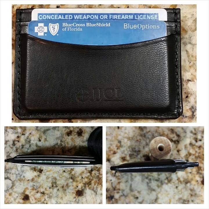 Time for a bigger card wallet. This one is carrying 5 full size cards, 2 mini cards and a couple bills of cash. It's wide enough for business cards and there's still room for another card or two. Dark chocolate goat.
