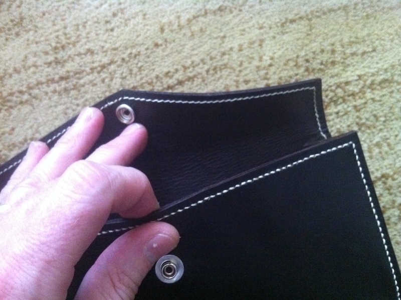 Small clutch with U-shaped gussets. Inside lined with French split goatskin. Saddle stitched with Lin Cable @ 9 tpi.