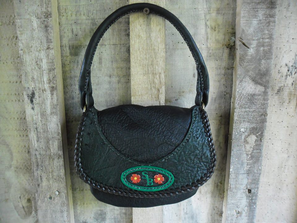 Black Bison with dark green ostrich sides, bottom, and overlay. Goatskin initial badge. Goatskin lace. Solid brass hardware. black dacron stitching.