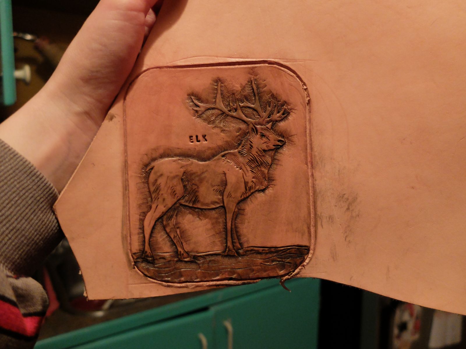 This is my first attempt tooling and antique staining a piece. Got impatient and didn't let the resist stay on overnight but still relatively happy with the results! Probably will make this into a patch for a backpack. Couldn't cut through the leather very easily and have since purchased a head knife which I love to use!