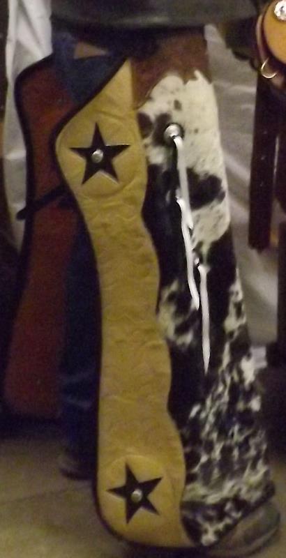 these chaps were made with the guy who has one heck of a ''man cave'' in mind .also they are functional,with lots of adjustment on waist n leg fits a 5/9 guy just right.styled from a pix of a bronc rider at ol cheyenne in 1920's belts are hand tool'd pm for priceing