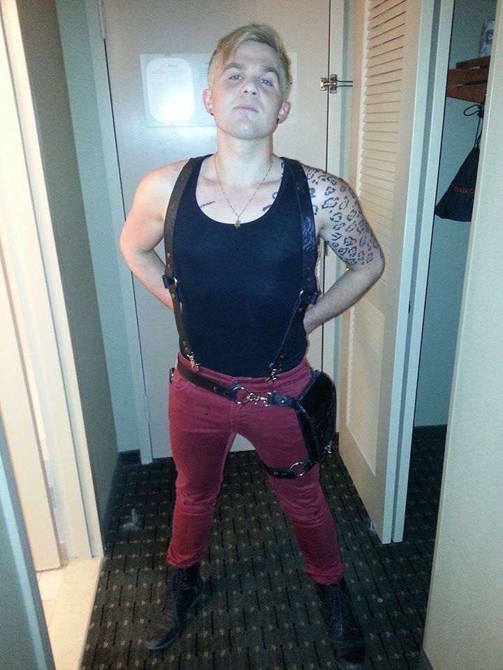 Boyfriend wearing new hip pouch and harness suspenders. You can't really see the tooling on them, I should get a better picture.