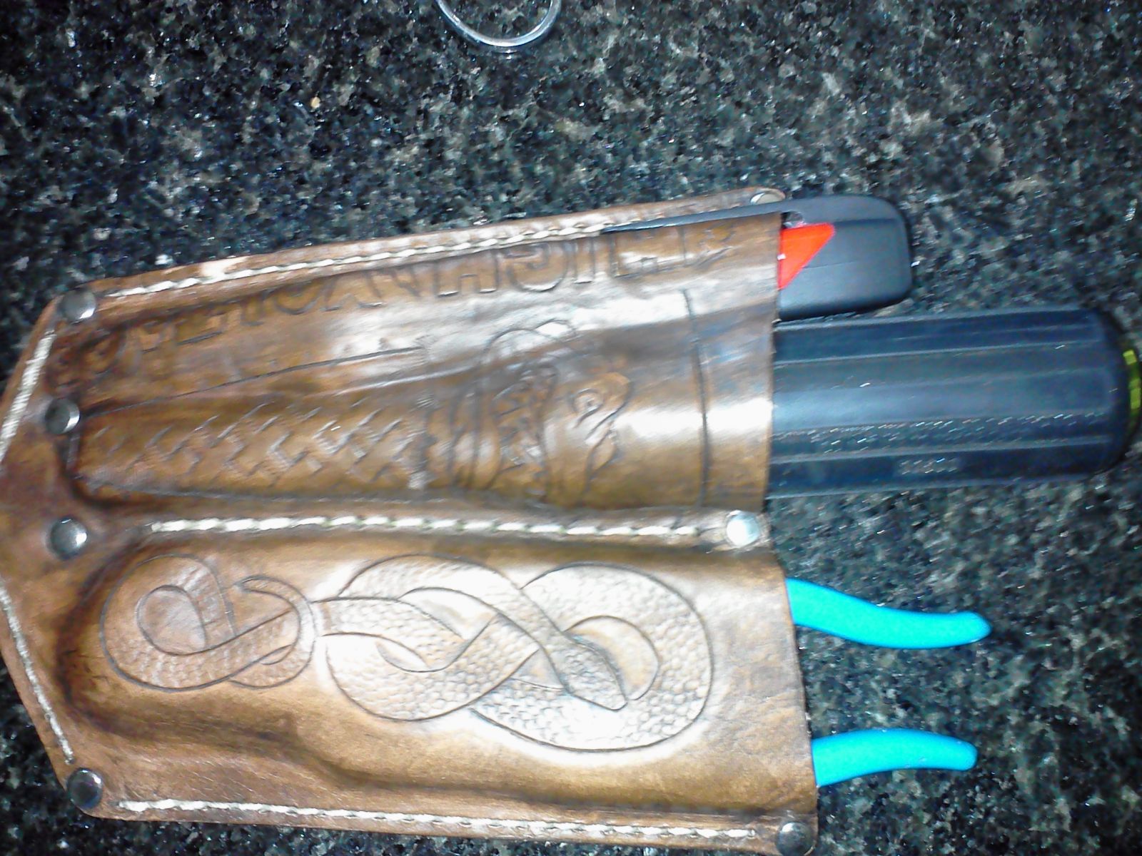 First try at a custom pouch with tooling on it. Forgot to space out the last part I was doing "high voltage". I remembered about halfway through tooling the letters. It was for my supervisor and he likes it. Uses it everyday. Fits back pocket of jeans perfectly, and has hard plastic tip in the bottom so the screwdriver will not come through the stitching. That was his problem in the first place. It was tearing up his pocket.