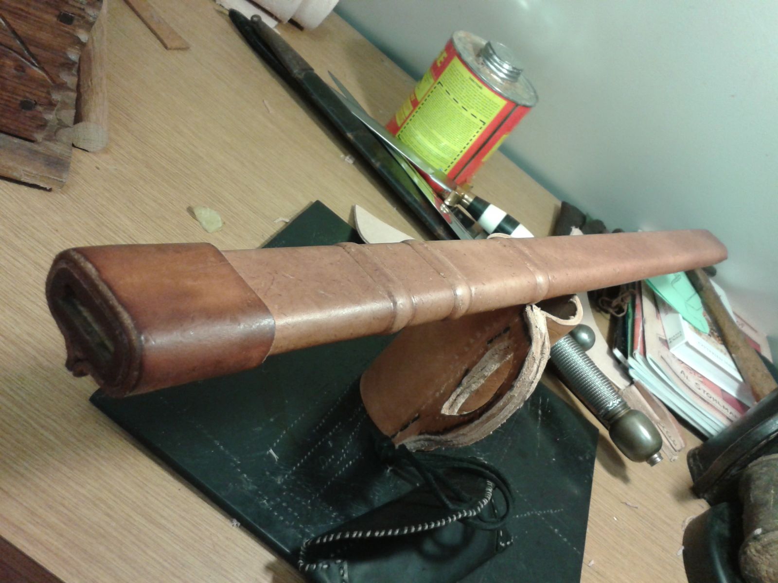 8-10 oz throat (I think). I applied neatsfoot oil with a wool dauber about 6 times, then applied beeswax. No dye used.