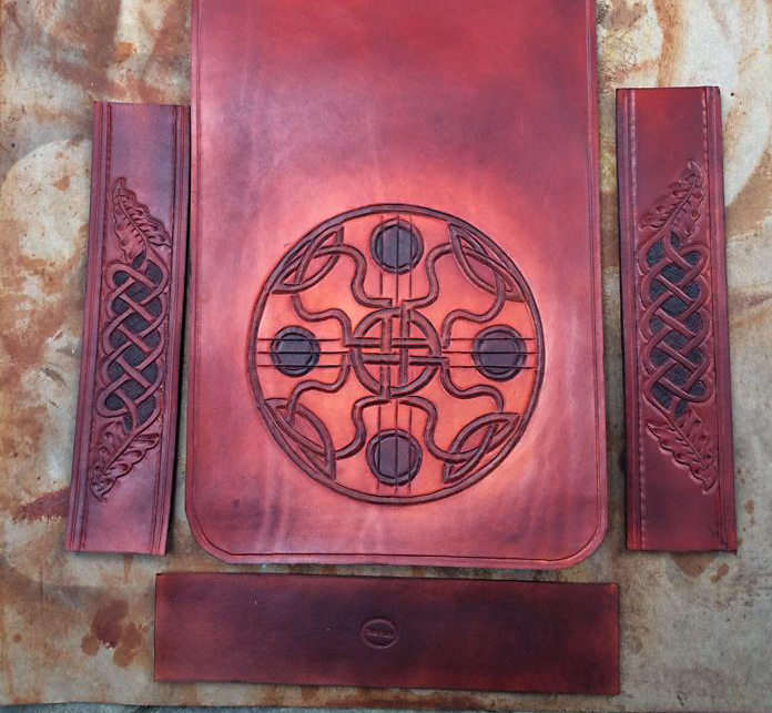 New project: Celtic guitars messenger bag back panel, celtic knot gussets, and will have a calf lining with pockets. Hermann Oak, Oiled, dyed, and drying in the shade.