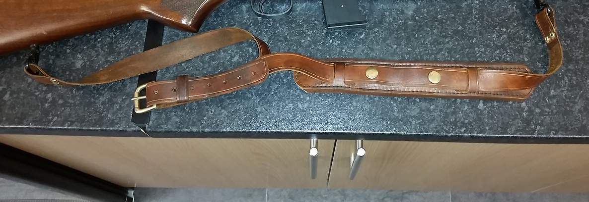 A stained cowhide sling for a client, fun to do and had a good amount of adjust-ability, can change out the padding part for another if need be.