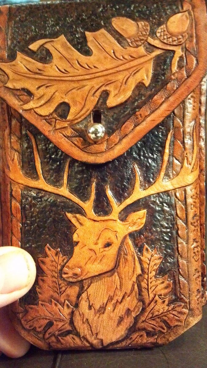 This is my first acorn leaf. Yeah, my carving is improving some. This is another saddle cell phone case for a roper friend.