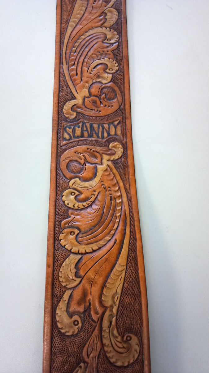 Another view of my 1st guitar strap. Also 1st time I used a wood burner to write on leather. At this point in my experience, It's easier than trying to carve a name with the swivel knife!