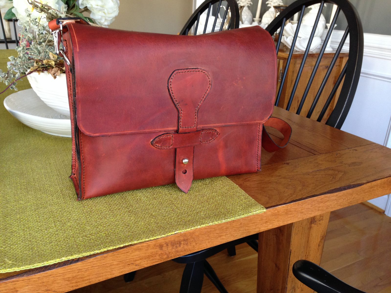 This is a leather handbag I made for my wife. I used oil tanned leather. Handstitched every single stitch. I added 2 D-rings to the inside to attach accessories like cellphones and makeup case's, keys.