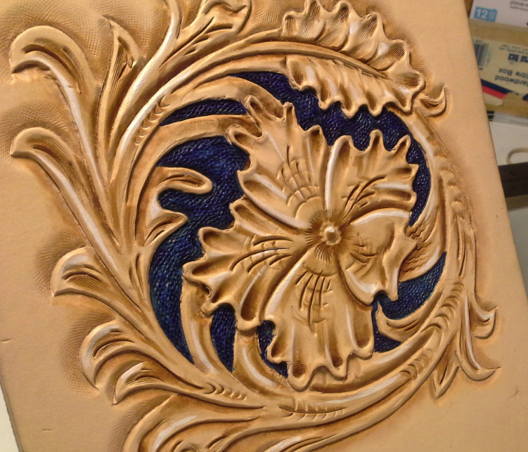 I found a piece of leather in a plastic bag that I had been casing and then forgot about. It had been about a week and a half so I used it to practice some floral carving and dyeing.