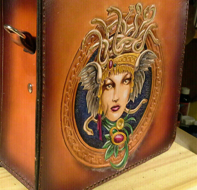 Members guybell Posted December 25, 2014 Report Coho, thanks for the feedback. The face is just hand painted with brushes using Fieblings leather dye diluted with solvent. I coated the face and circle with neat lac. Then I dyed background with a dauber using Beige Fieblings dye. I then airbrushed the edges with dark brown and rubbed it with wax. Still experimenting with coloring leather but I really like the Fieblings alcohol based dyes. Quote