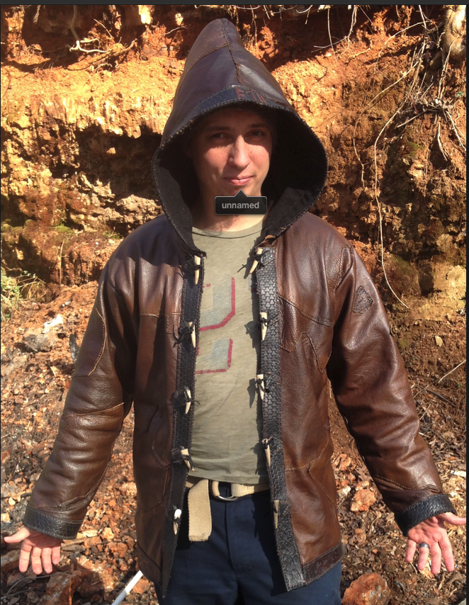 Leather jacket made from 3 oz cowhide and the trim is done in 5 oz vegtan basket weave stamped and hand carved designs. Lining is 100% wool. Toggles are deer antlers to close.