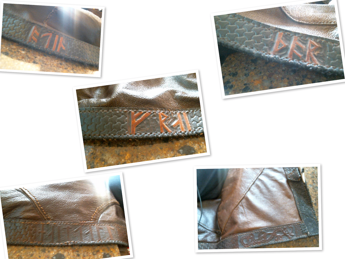 This is the trim of my jacket. Hand dyed and stitched. I used Younger Futhark for the runes and traditional hart and viking snake carvings. The runes read Odin, Thor, Frey and Heimdall. I used 5oz veg-tanned leather for the trim. I understand that this is not elder futhark.