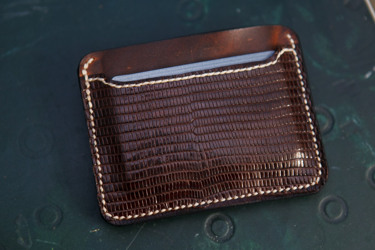 Minimalist wallet in Dublin and lizard (backed with pig).