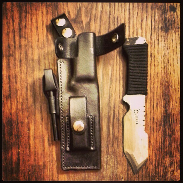Belt sheath for the knife my friend made for himself. Sharpening stone pocket on front. Ferro rod loop on side. Designed for belt or dangle carry.