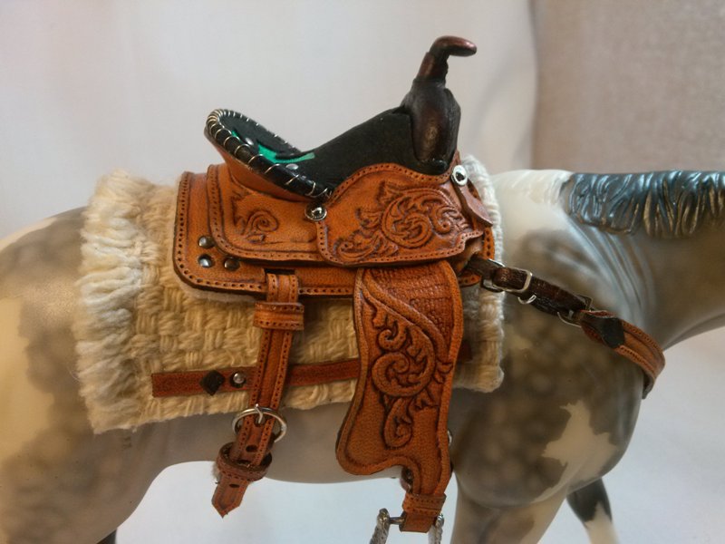 This is a Classic sized Saddle to fit Breyer and Stone Classic horses. I dyed it with Saddle Tan. Sheridan Style carving on it. The bottom skirt on this size is 1 and 3/4's inch long. It has a cut-out Cross on the seat. With black leather. This Saddle pad was too big for it, so sold the set with a different pad.