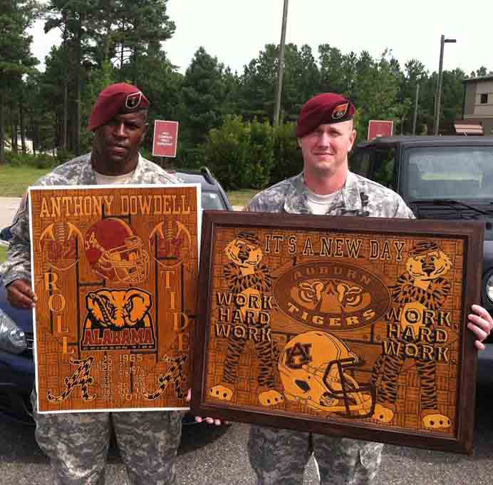These are the two biggest and best plaques that I've done so far. I'm holding one that I did for Coach Gus Malzahn...the Head Football Coach at Auburn University. He DIDN'T order/pay for it...I did it and sent it down to him out of gratitude. My buddy in the photo is Anthony Dowdell...he played football at Alabama from '92 to '97. We were in the same unit at Fort Bragg.