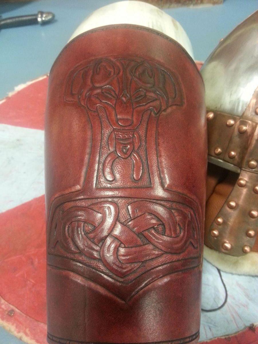 A commision for a horn holder with the wolves of Thor hand tooled. It was requested as the chap who wanted it has the same tattoo on his arm.