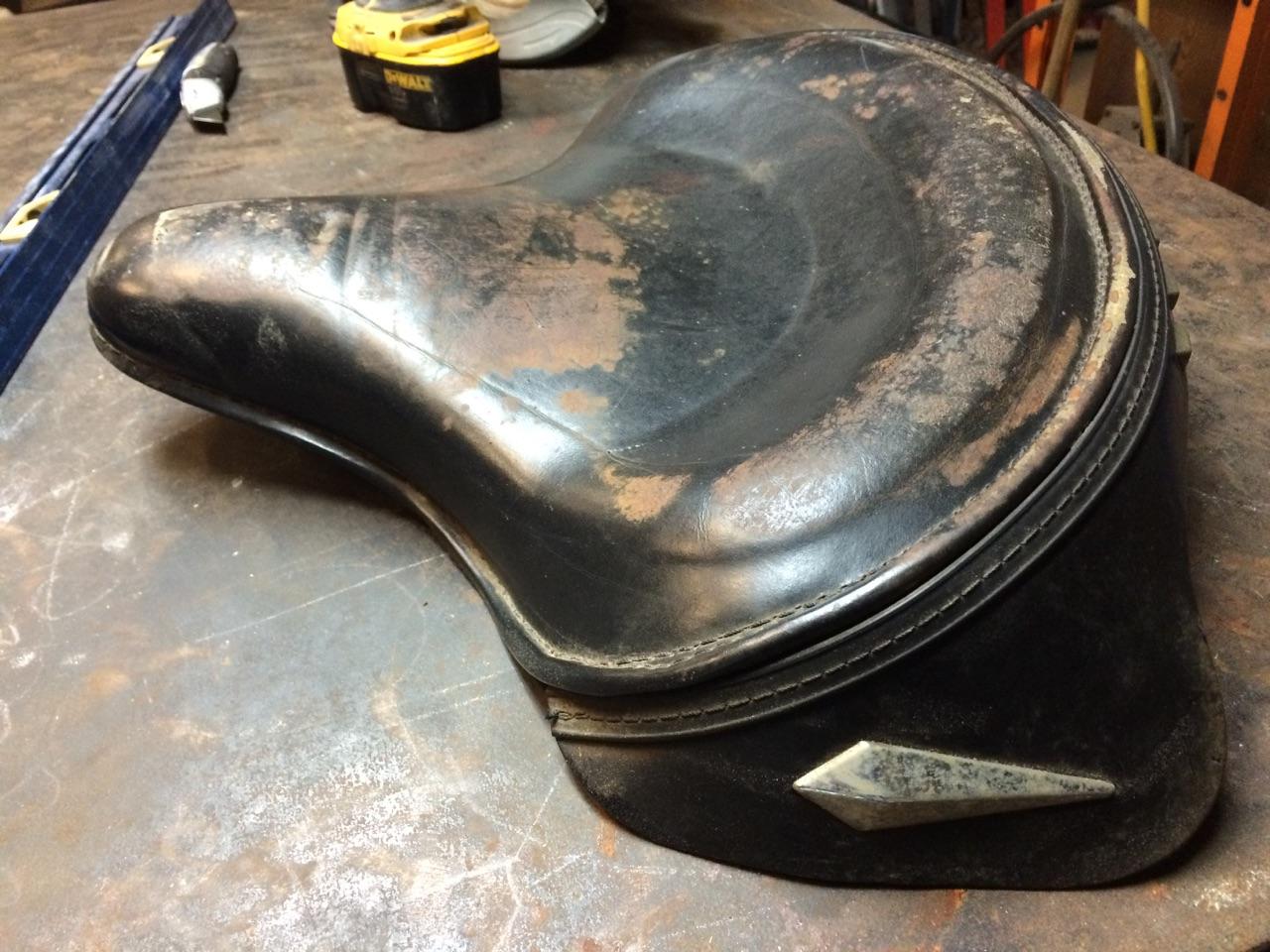 A customer's seat needing to be restored. This seat is from the late '50s to early '60s. The seat was covered in rust and had some tearing but for the most part the leather was in good condition.