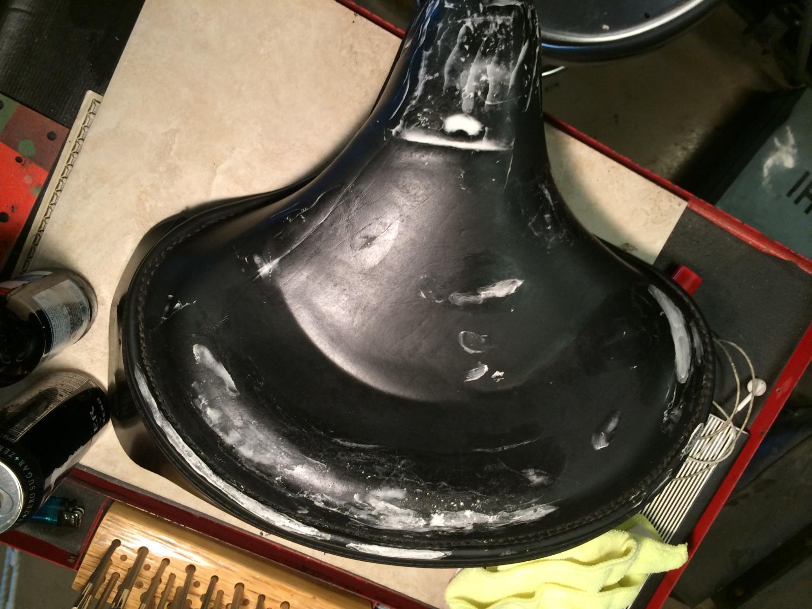 A customer's seat needing to be restored. This seat is from the late '50s to early '60s. The seat was covered in rust and had some tearing but for the most part the leather was in good condition.