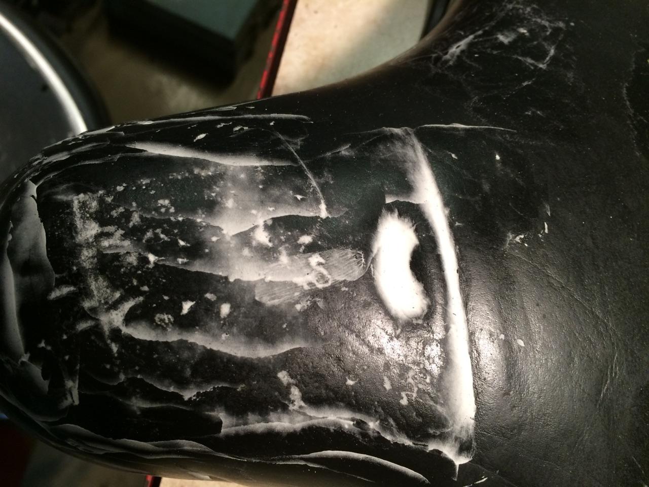 A customer's seat needing to be restored. This seat is from the late '50s to early '60s. The seat was covered in rust and had some tearing but for the most part the leather was in good condition.