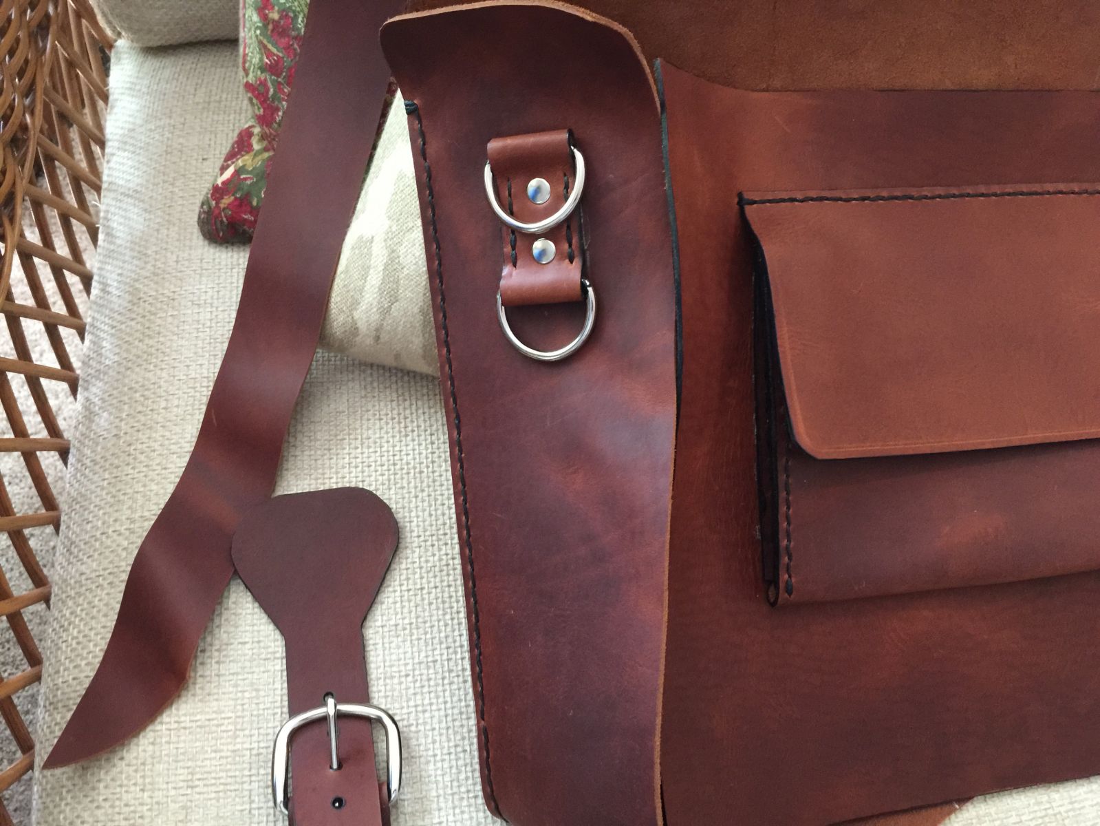 Briefcase made from oil tanned leather with black thread and the edges dyed black. The leather is "RanchHand" from Springfield Leather, it's great stuff to work with. This oil tanned leather really is beautiful leather to make bags and accessories with. The bag measures 13" wide, 11" tall and 3" deep. I used 8 square feet of leather to make the bag, I was sweating all the way to the last stitch. I learned a great deal about measuring my projects before ordering the leather. I made the pattern based on the size of a legal pad.