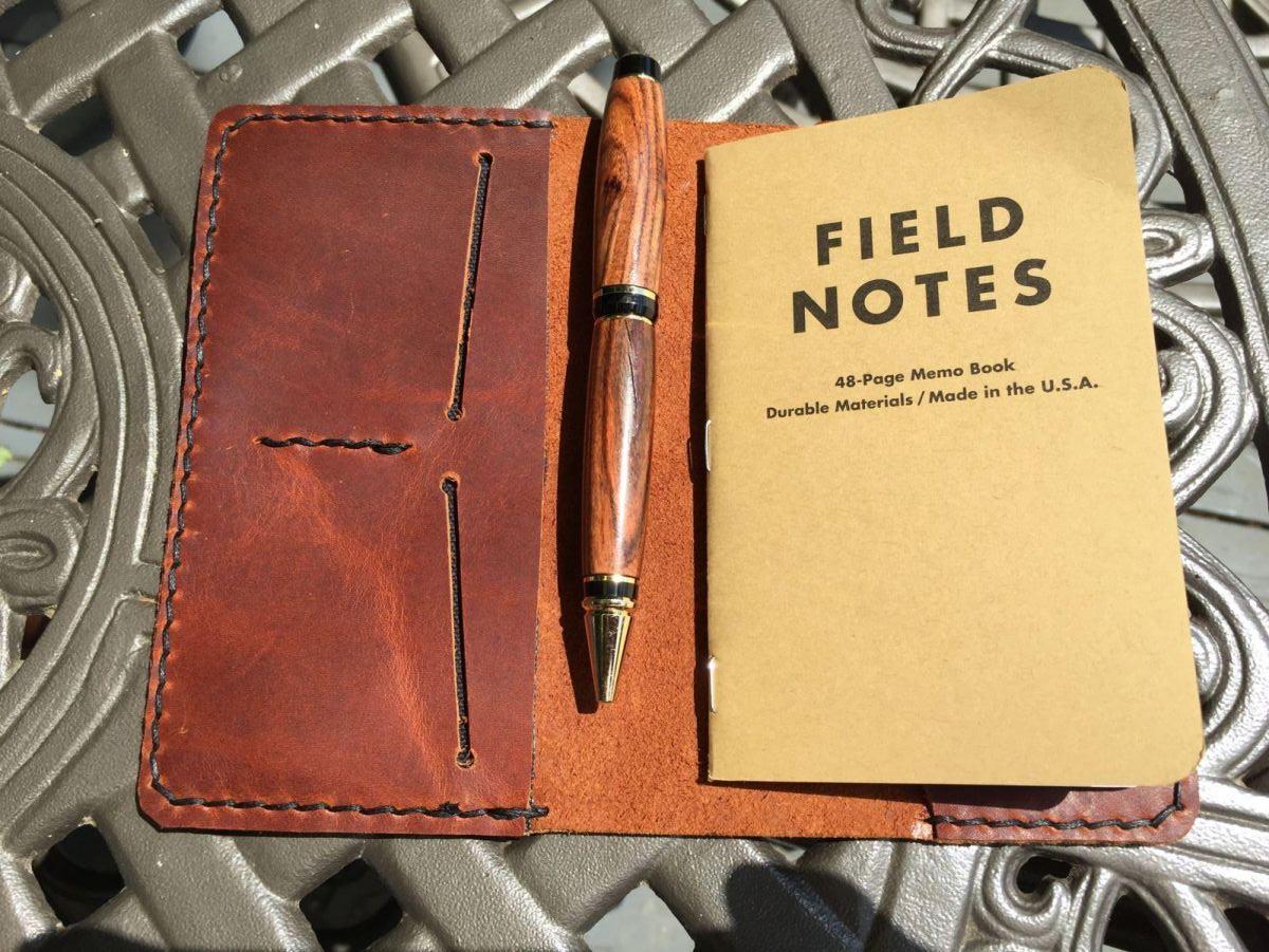 This is a Field Notes cover I made out of some left over oil tanned "RanchHand" leather I got for another project. The cover has two card slots and one slot for notes, bills or whatever else you can fit in the slot. The pen is a Cigar pen I turned years ago.
