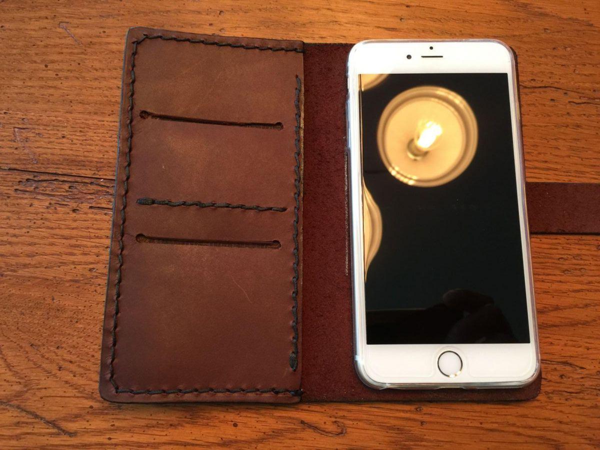 This is a iPhone 6 Plus wallet I made from "English Chestnut" oil tanned leather. The cover has two slots for cards and one for bills or notes. The phone holder I got for 2 bucks off the internet. It's clear so you only see the phone. Sorry about the reflection on the phone, it's the light hanging in the dining room.