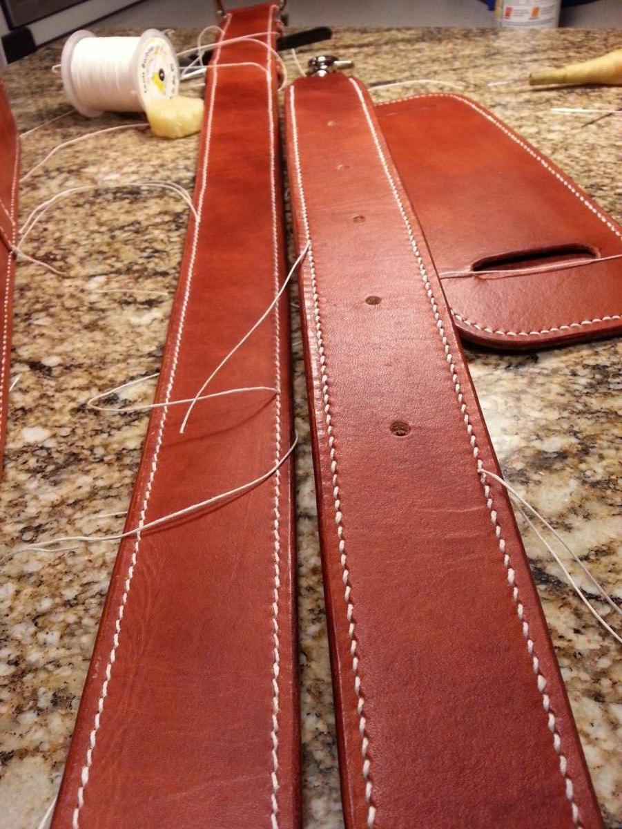 On the left, is a strap showing the reverse or back side of the stitching, prior to trimming the threads and tapping down. On the right is the front or top side of the stitching, also before trimming or tapping down. For me, this is a big improvement. There are fewer "fat" and "skinny" stitches, the reverse side is straighter, and has a much better "lay." It was obvious from the previous images that I was having difficulties keeping the awl even and exiting with the same sized holes. I made a lot of adjustments to get here, but the main things were: Increased lighting: 4 ea 100 watt bulbs seemed to help me see what I was doing better. Putting a LOT of wax on the thread drastically improved the "twisting" I was experiencing, and reduced the "fat" and "skinny" stitches. Keeping the exit hole as small as possible also helped.