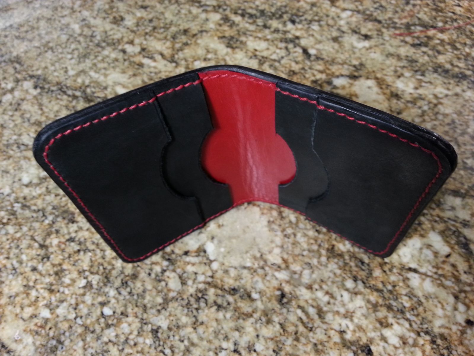 Getting better... I kind of like the stitching on this one. I used Campbell's Satin Laid 332 Linen thread, red, on black leather for a cool contrast.