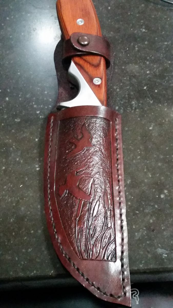 My first sheath I am pleased with the results all hand cut, carved, stitched and dyed.