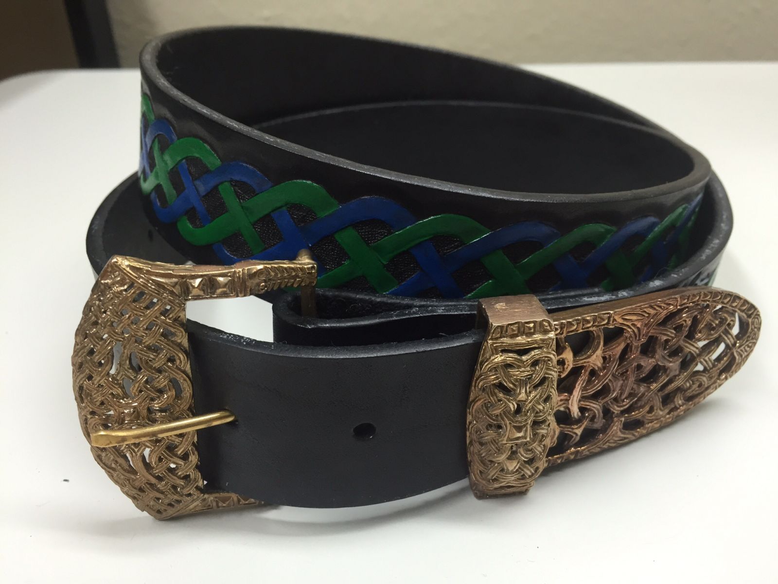 A Celtic knotwork belt with a hand-drawn Oroboros design I drew.