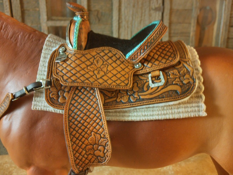 Western Saddle is Saddle Tan in color with Turquoise accents. Bottom skirt is only 3 inches long. Fenders are adjustable on the Traditional sized Saddles I make. Sold.