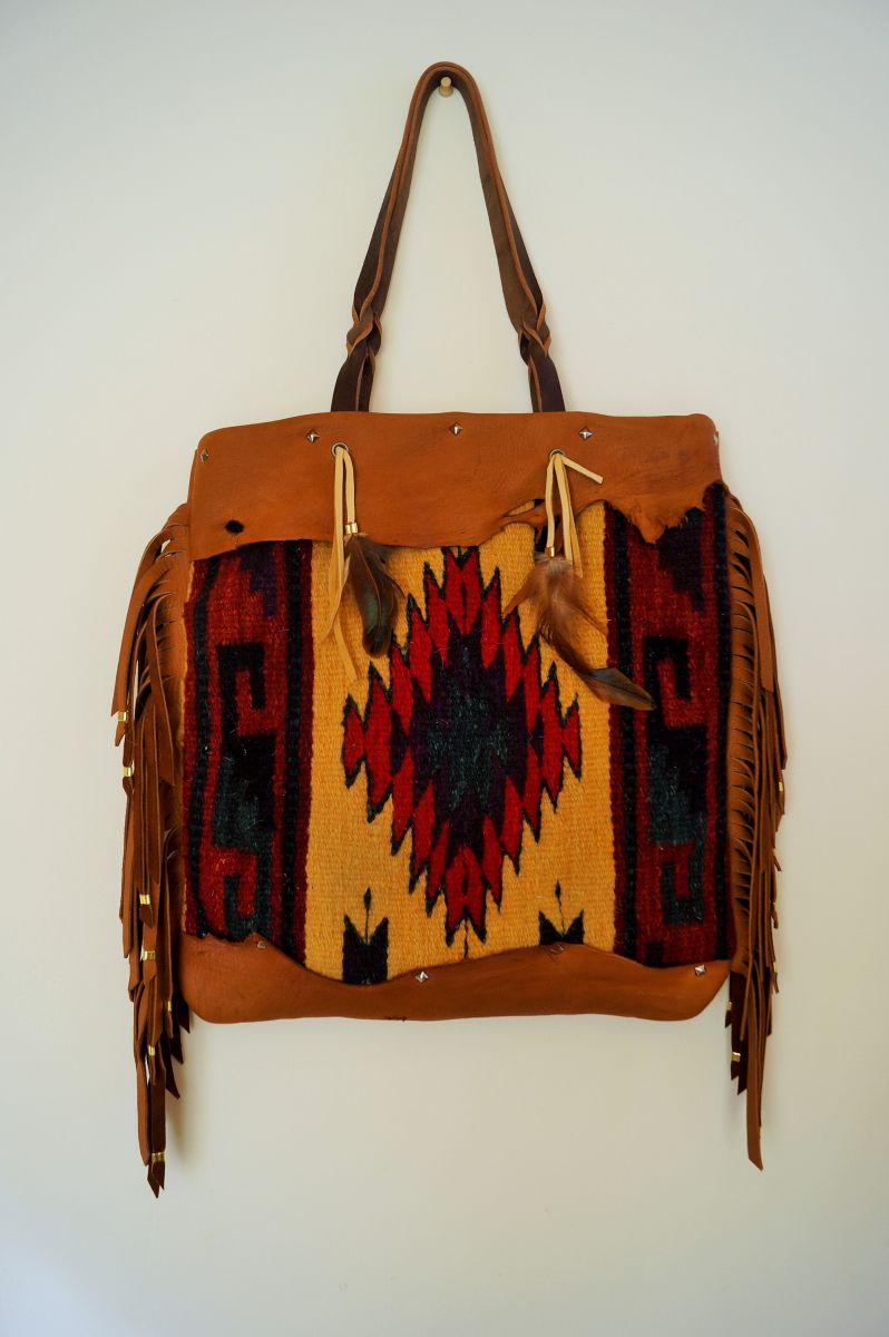 Large tote with two interior pockets entirely lined with limited edition Indian block print fabric. Made with vintage wool woven textile on front and soft cowhair on back.