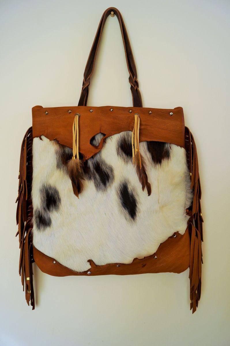 Large tote with two interior pockets entirely lined with limited edition Indian block print fabric. Made with vintage wool woven textile on front and soft cowhair on back.