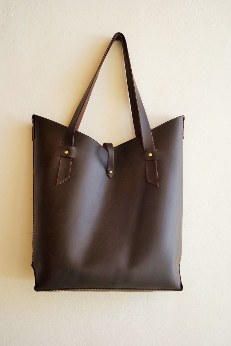 Large, roomy, tote with hanging interior pocket. Entirely pieced and sewn by hand.