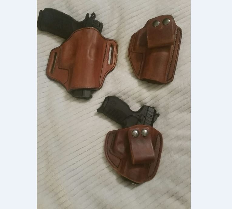 This is a pic of the 1st 3 holsters I ever made. Top right was number one, top left was number two, and bottom was number 3. The top two fit a CZ P-09 and the bottom is for a Ruger SR22.