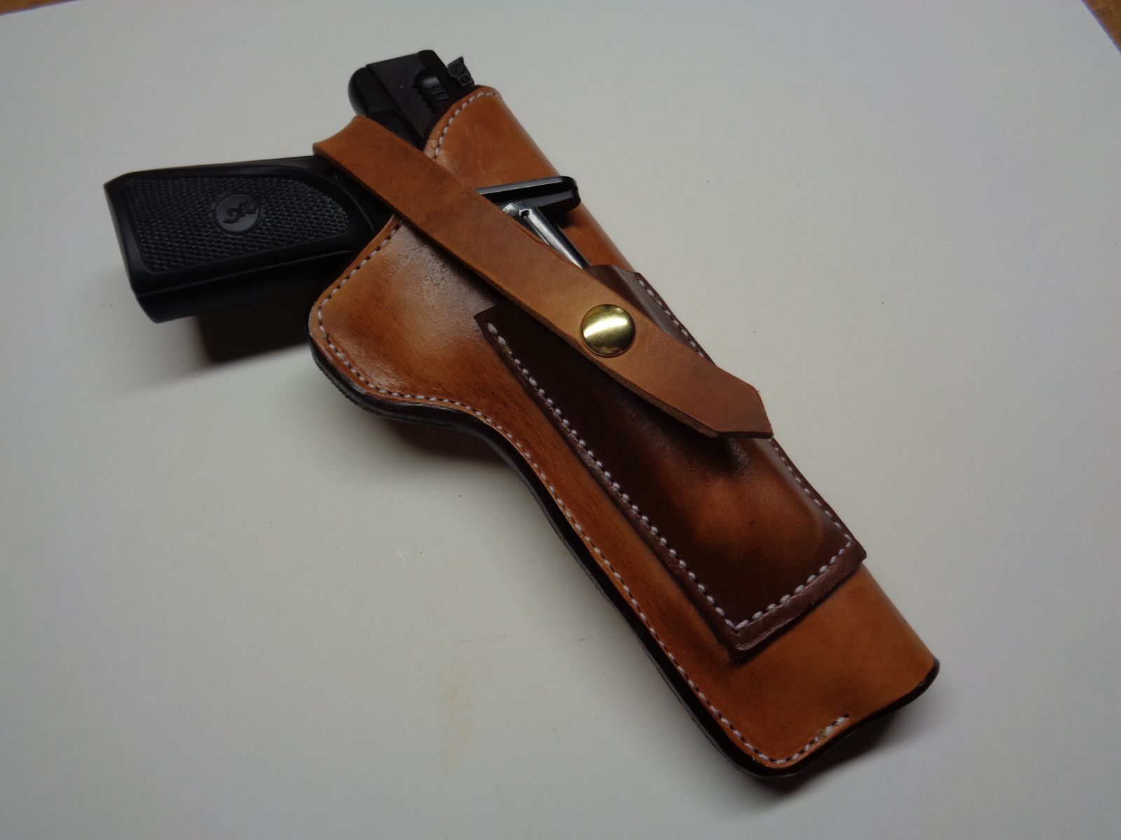 This was a one-off for a customer that had a Buckmark with a threaded barrel. None of the production holsters would accept the extra length. Yes, the mag pouch was a bit of a pain.