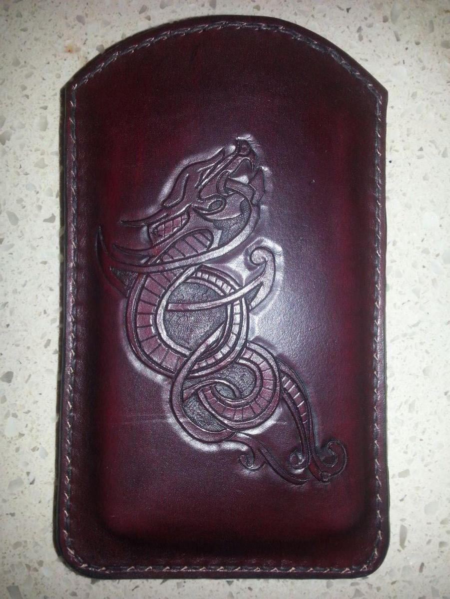 Phone case. Made from 6oz veg tanned leather for the back and middle piece, 4oz for the card/money slot. Dyed with oxblood and black antique. Finished with snow-proof. Fits the Samsung S3 perfectly but a little short for the Samsung Grand Prime