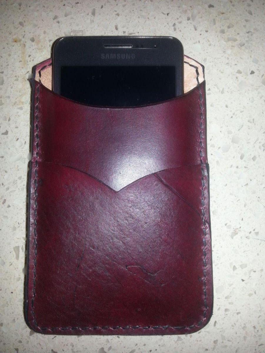 Phone case. Made from 6oz veg tanned leather for the back and middle piece, 4oz for the card/money slot. Dyed with oxblood and black antique. Finished with snow-proof. Fits the Samsung S3 perfectly but a little short for the Samsung Grand Prime