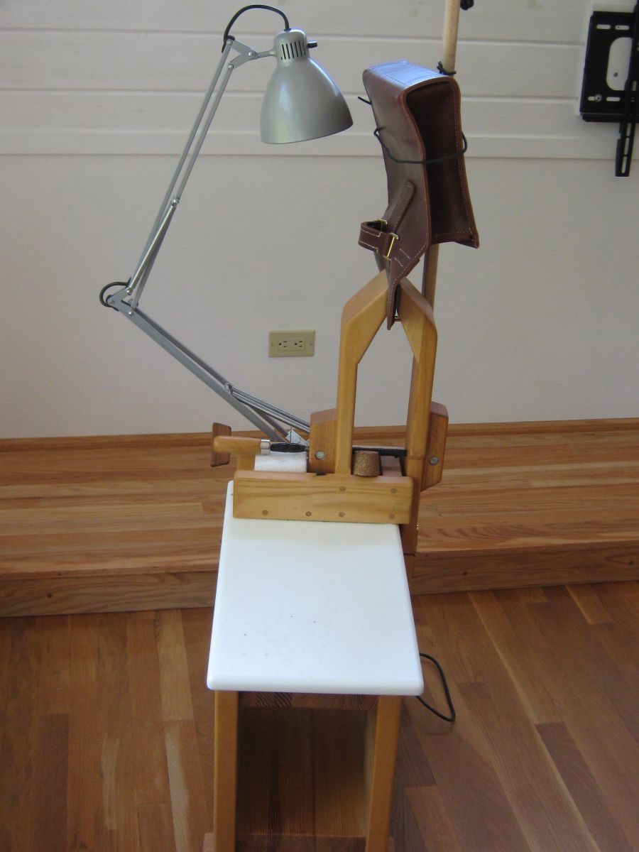 Members JamesR Posted January 13, 2016 Report I made this a number of years ago. It uses the metal screw from a Jorgensen woodworking clamp. It is made of ash with maple jaws.I have it mounted on a low bench which doubles as a seat. It is set up for a lefty. The extended handle on the left is far enough away to prevent the cord from getting tangled. The throat depth is about 12 1/2" to the top of the jaws. (Wish I had made it deeper) Quote